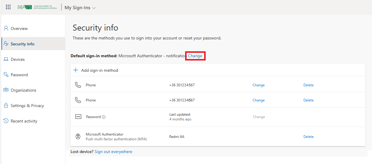 1. Log in at https://myaccount.microsoft.com with your MATE ID (ending with @uni-mate.hu, e.g. Abc1234@uni-mate.hu) and the password you set on the JoKeR site. If you logged in successfully, click on the Security info menu.