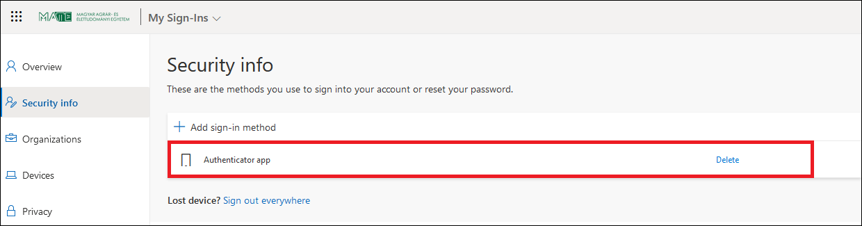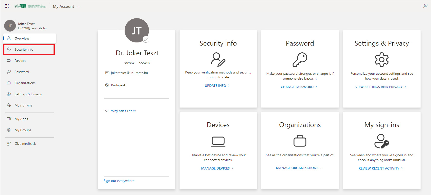 4. Log in at https://myaccount.microsoft.com with your MATE ID (ending with @uni-mate.hu, e.g. Abc1234@uni-mate.hu) and the password you set on the JoKeR site. If you logged in successfully, click on the Security info menu.