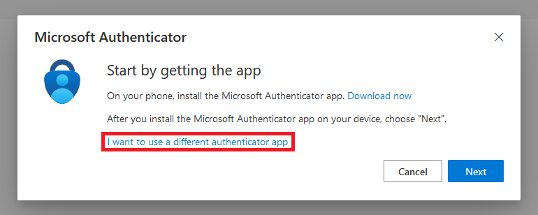 5. In the next window, click the I want to use a different authenticator app link.