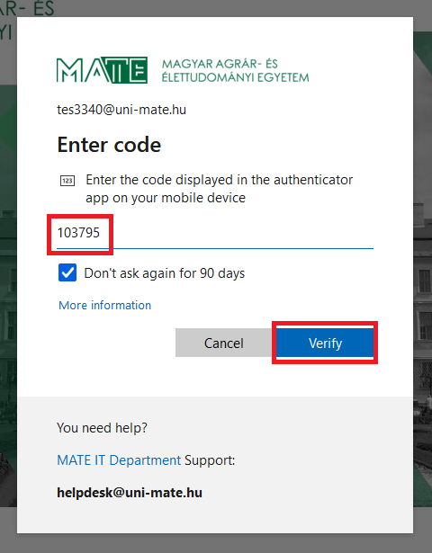 14. After activating multifactor authentication, you must enter the code shown in the authenticator app in the browser window when you want to access M365 services (e.g. Outlook mail) from outside the university.