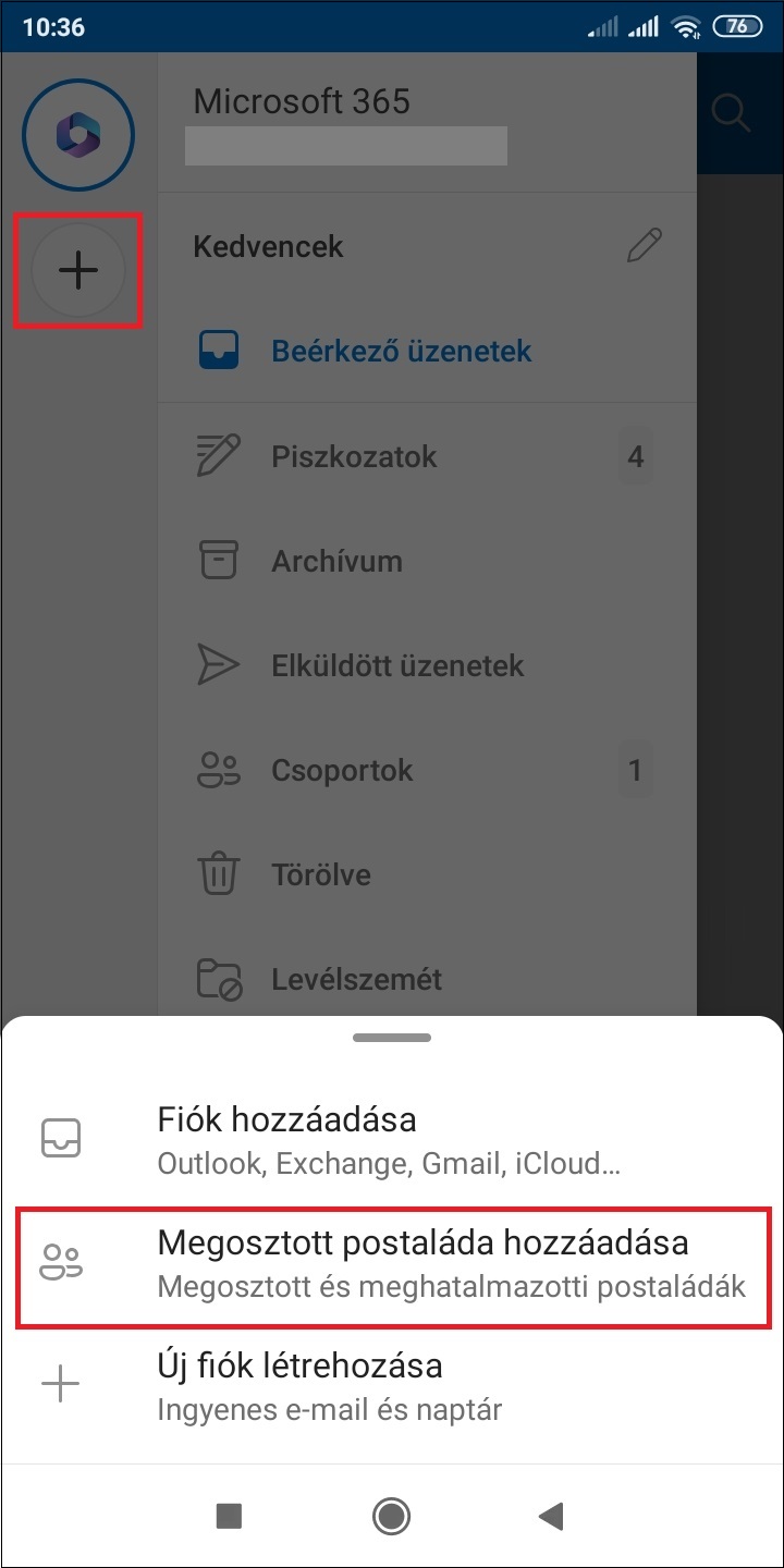 2. Nyomja meg a fiókhozzáadás + gombot, majd válassza a Megosztott postaláda hozzáadása lehetőséget.
