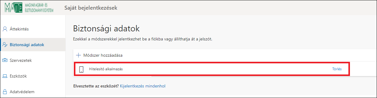 Amennyiben már nem fér hozzá az eszközhöz, vagy törölte a korábban beállított authenticator alkalmazást, kérjük jelezze a helpdesk@uni-mate.hu email címen és az IIG munkatársai eltávolítják a korábban megadott másodlagos hitelesítési módszert.