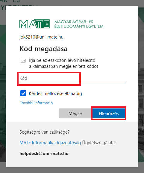 12. A kétfaktoros hitelesítés aktiválása után, továbbiakban amikor az egyetemen kívülről szeretne hozzáférni az M365 szolgáltatásokhoz (pl. Outlook levelezés), a böngészőprogramban meg kell adni a hitelesítő alkalmazásban látható kódot.