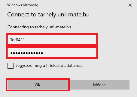 5. A rendszer hítelesítést fog kérni, itt adjuk meg a MATE azonosítónk és a hozzá tartozó jelszót, majd kattintsunk az OK gombra.