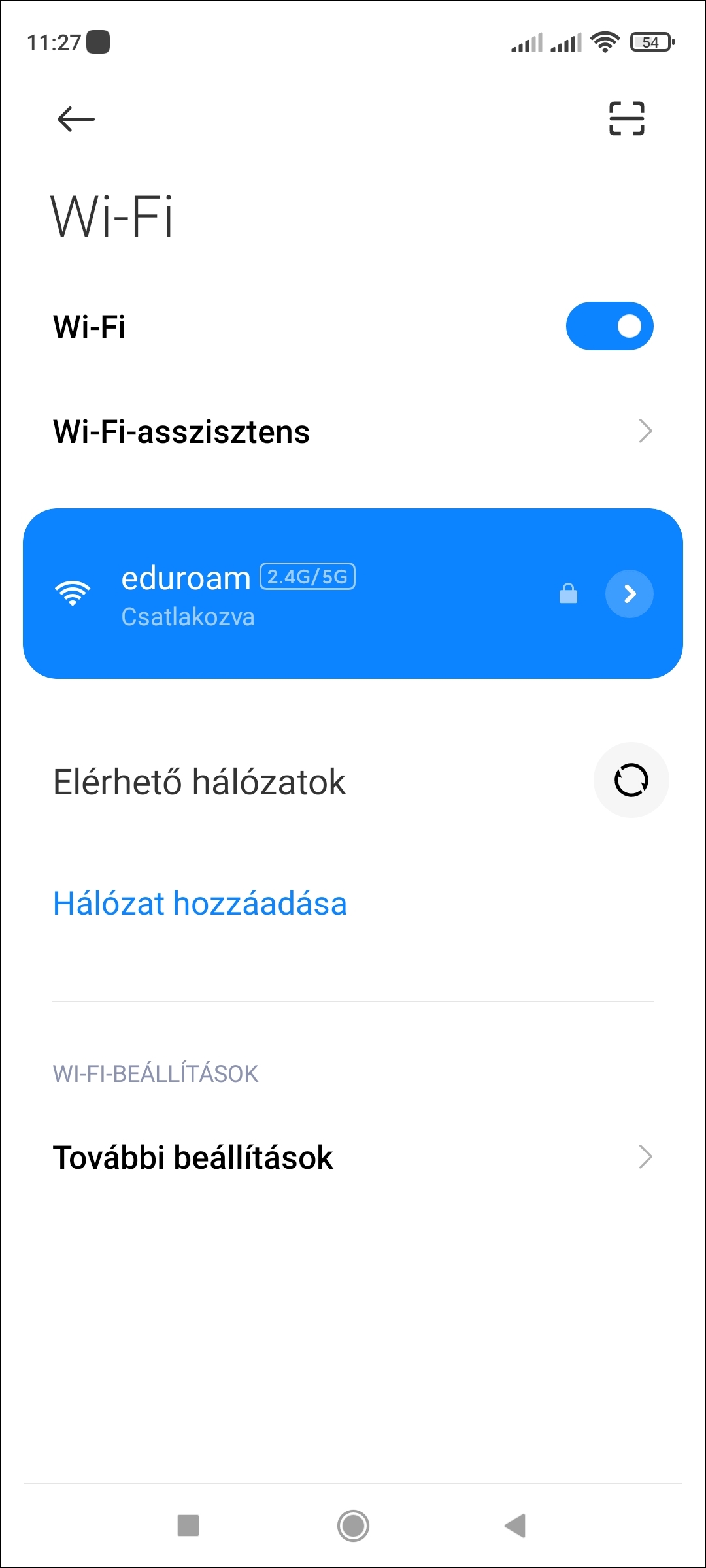 5. Amennyiben mindent megfelelően csinált, pár másodperc után, a készülék kijelzi, hogy Csatlakozva van az eduroam Wi-fi-hez.
