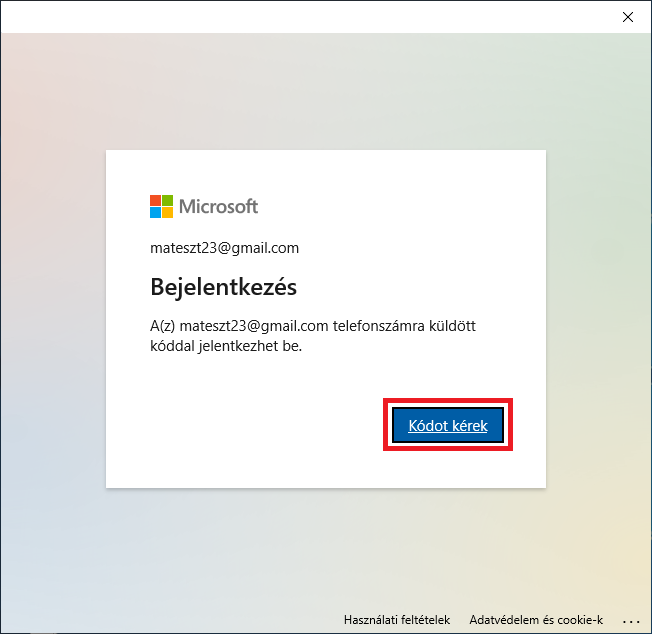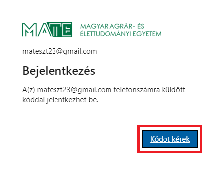 3. A böngészőprogramban megnyíló új lapon kattintson a Kódot kérek gombra. Ne tévessze, meg, hogy az üzenetben az szerepel, hogy a „A(z) … telefonszámra küldött kóddal jelentkezhet be.” üzenet jelenik meg. A kód az ön e-mail címére fog megérkezni.