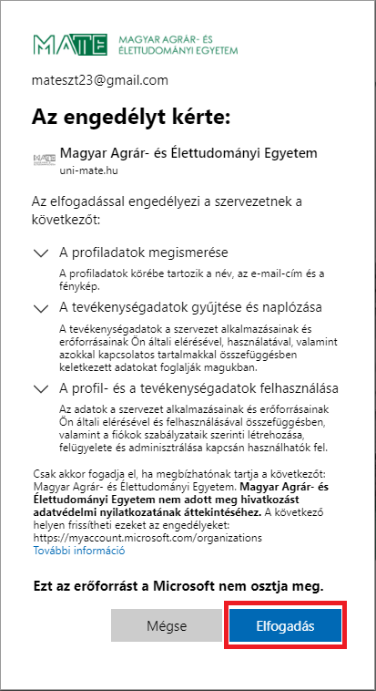 5. A következő lapon el kell fogadni a meghívó szervezet adatvédelmi nyilatkozatát. Ehhez kattintson az Elfogadás gombra.