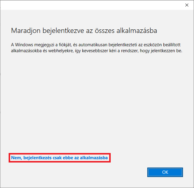 13. Ha szeretné a Windows megjegyzi a fiókját, így kevesebbszer kéri a bejelentkezést. Ehhez kattintson az OK gombra. Egyébként kattintson a Nem, bejelentkezés csak ebbe az alkalmazásba hivatkozásra (javasolt).