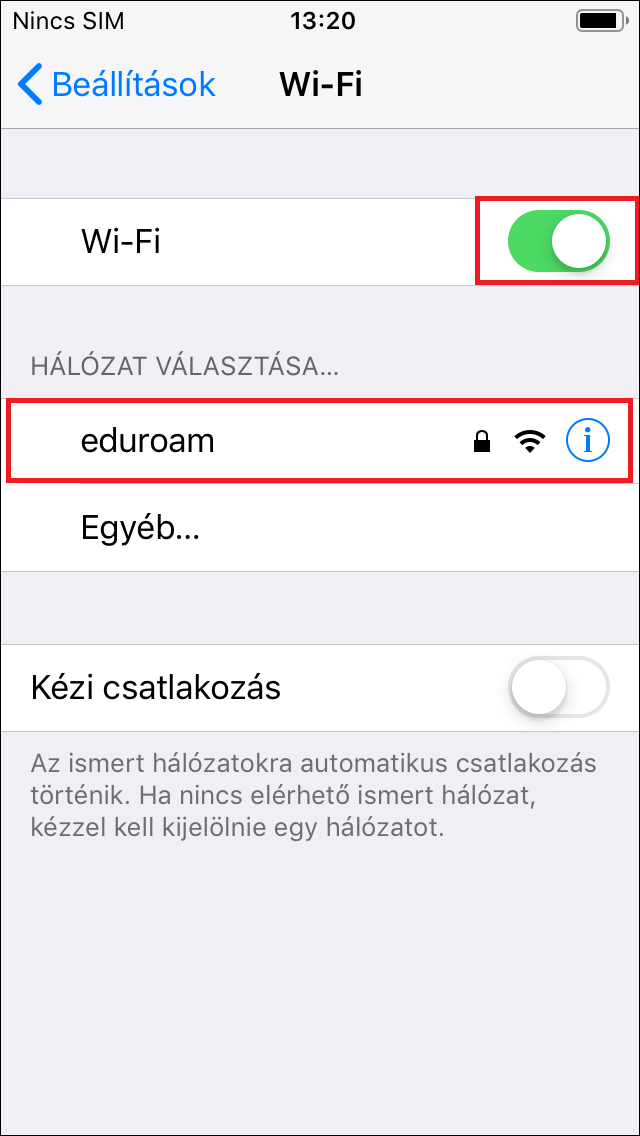 3. Ha szükséges kapcsolja be a Wi-Fi-t, majd az elérhető hálózatok közül válassza ki az eduroam-ot.