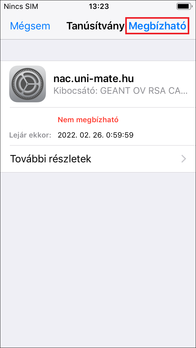 5. Ha szükséges akkor a következő lapon kattintson a Megbízható feliratra a tanúsítvány elfogadásához.