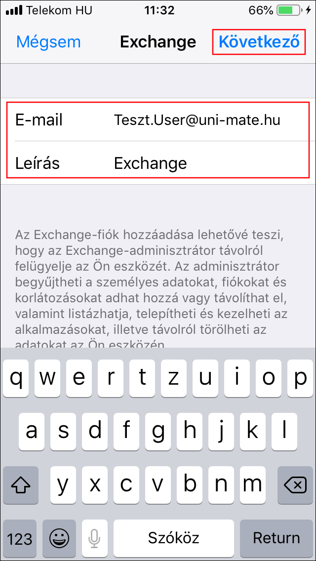 5. Az E-mail sorban gépelje be az e-mail címét. A Leírás sorban egy nevet adhat a fióknak ez alapértelmezetten Exchange. Az adatok bevitele után kattintson a Kövekező hivatkozásra.