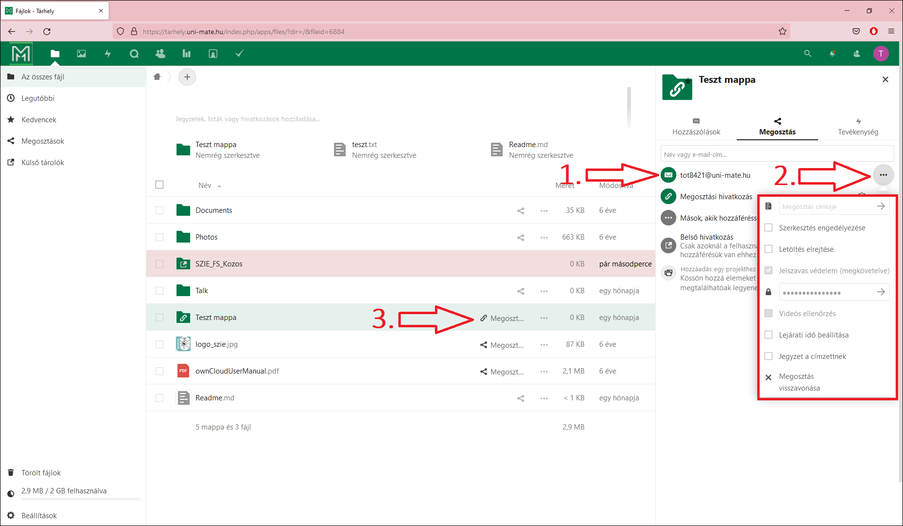 A MATE Tárhelyen lévő megosztott tartalmak mellett (3.pont) megosztást jelző ikon szerepel.