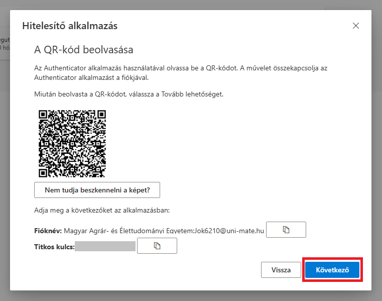 majd a megjelenő ablakban adja meg az előzőleg kimásolt hitelesítő kódot és kattintson ismét a Következő gombra.