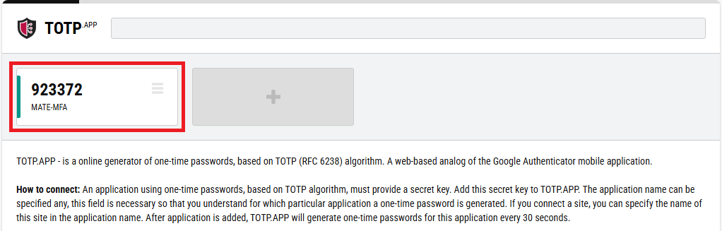 11. A megadott nevű alkalmazás hozzáadása sikerült. Az alkalmazás neve felett 30 másodpercenként új hitelesítőkód generálódik. Másolja ki a hitelesítő kódot.