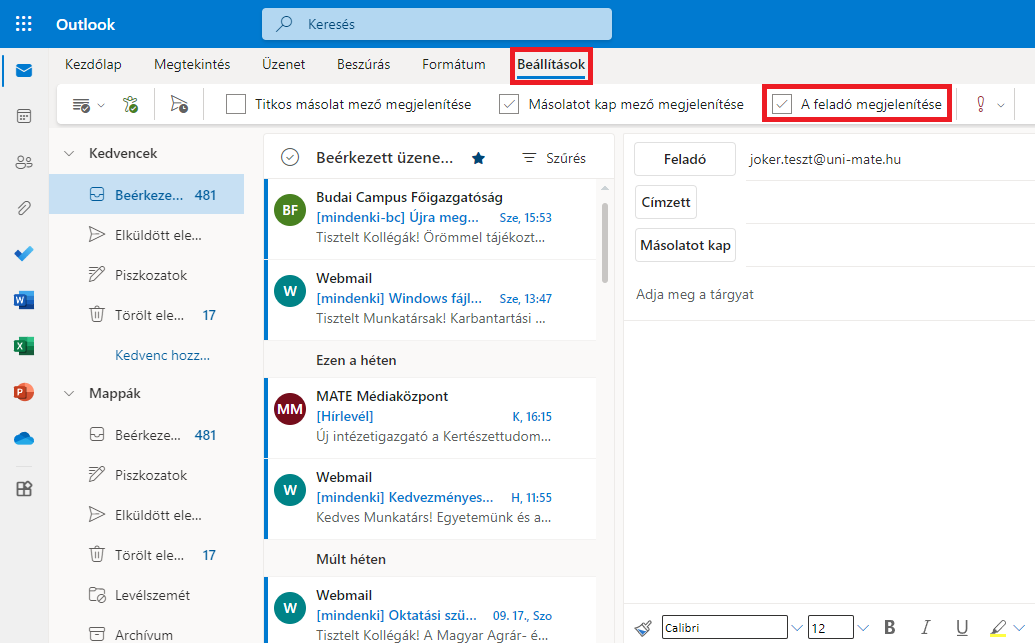 5. Új levél küldéséhez kattintson az Új üzenet gombra. A szerkesztő területen válassza a ... ikont majd a helyi menüből A feladó megjelenítése pontot, vagy válassza a Beállítások menüpontot és tegyen pipát A feladó megjelenítése jelölőnégyzetbe.