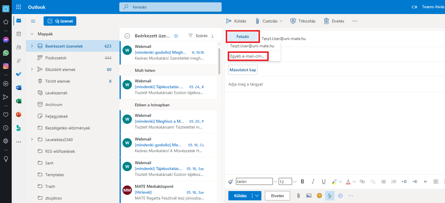 Amennyiben van jogosultságunk ahhoz, hogy a megosztott postaládából üzenetet küldhessünk akkor a következő módon van lehetőség a feladó kiválasztására.