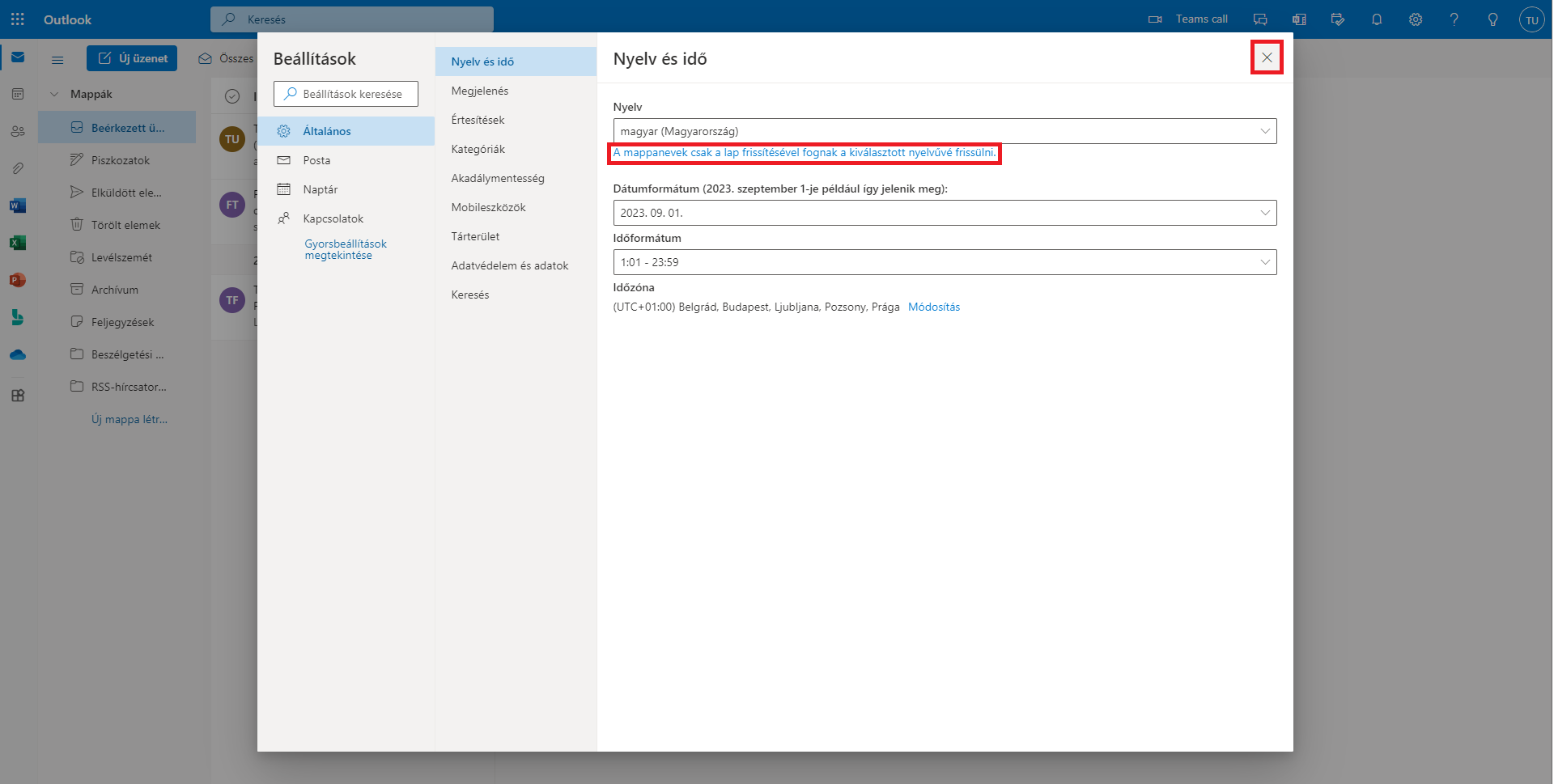 - A beállítások mentése után az ablak nyelve rögtön magyarra változik. Zárja be a beállításokat a jobb felső sarokban lévő X ikonon való kattintással. Előfordulhat, hogy a mappanevek csak a lap frissítése után fognak a kiválasztott nyelvűre frissülni. Az Outlook asztali alkalmazásban is ezen lépésk végrehajtása után változnak magyarra a mappanevek.