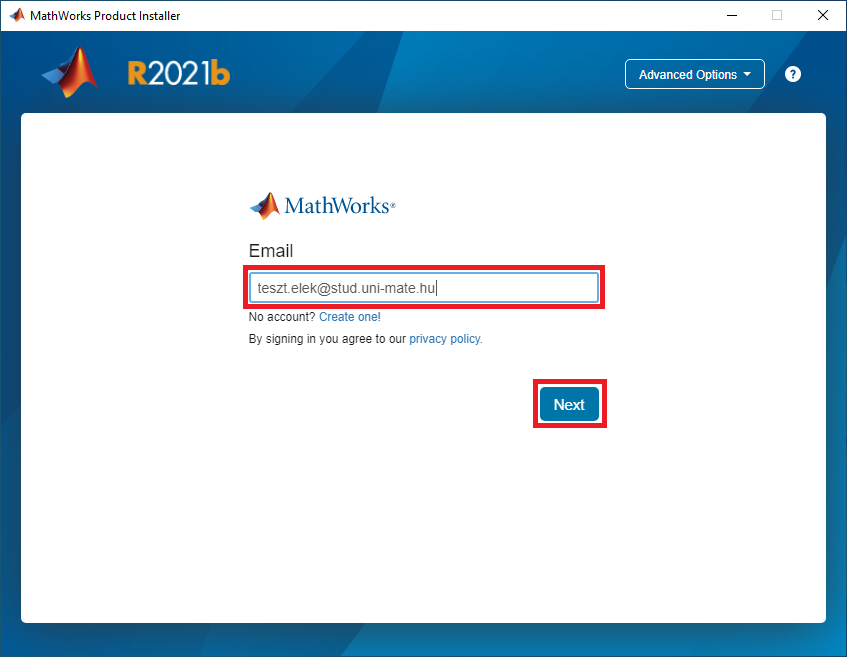 1. Indítsa el a letöltött telepítőkészletet. A megjelenő ablakban adja meg az egyetemi e-mail címét, amivel regisztrált és kattintson a Next gombra.