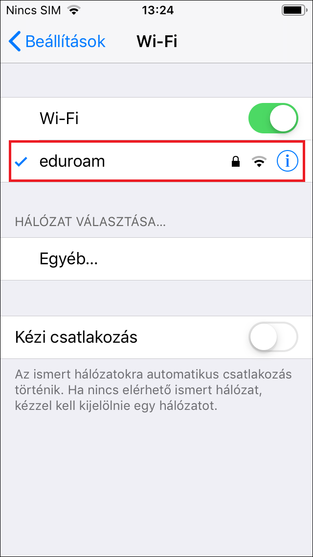 6. Amennyiben jól adta meg az adatokat, a készülék csatlakozik az eduroam hálózathoz. Ezt a hálózat neve előtti pipa jelzi.