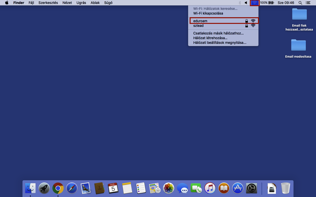 1. A képernyő jobb felső részén található Wi-fi ikonra kattintson, majd válassza ki az elérhető eduroam hálózatot.