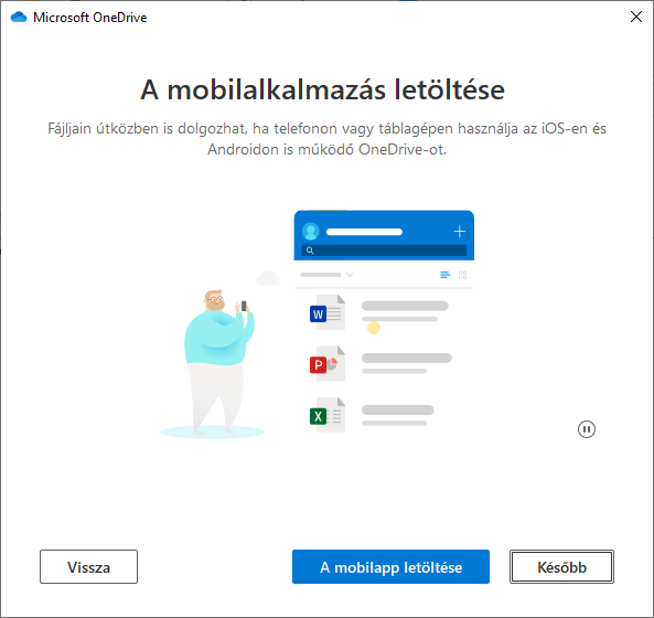 7. A OneDrive mobil alkalmazás telepítését ajánlott a Google Play áruházon vagy az Apple App Sotre-on keresztül elvégezni. A Később gombra kattintva lépjen tovább.